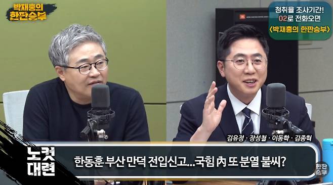 그러면 누가 과연 이 부산에서 보수를 대표해서 민주당의 바람을 잠재울 수 있을 것인가라는 것들에 대한 기대가 있으니까 김도읍 의원도 안 돼, 한동훈 내보내야 돼. 그리고 서병수 당협위원장 우리 또 시장까지 하신 분도 무조건 한동훈 보내야 돼라고 하는 거고 한기호 의원이라든가 김성원 의원 뭐 이런 분들 다 중진 의원들이잖아요. 이분들 3선 이상의 의원들이 다 그렇게 주장을 하는 거예요. 곽규택 의원은 공관위원임에도 불구하고 그런 생각을 하고 있는 거고.