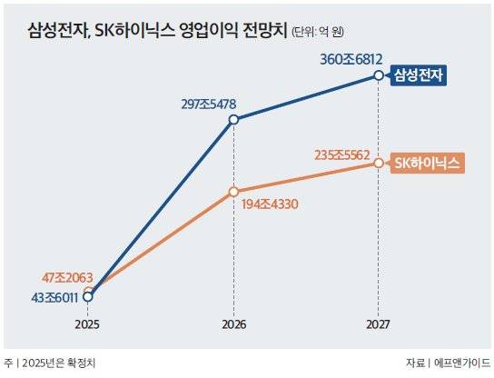 SK하이닉스 역시 고액 성과급 지급 가능성이 거론된다. 올해 임직원 성과급이 10억 원을 넘길 수 있다는 전망도 나온다. SK하이닉스는 지난해 9월 노사 합의를 통해 기존 기본급 1000%로 제한됐던 성과급 상한을 폐지하고, 영업이익의 10%를 초과이익분배금(PS)으로 지급하기로 했다. 실적이 개선될수록 성과급도 함께 늘어나는 구조다.국내 증권사 컨센서스(평균 예상치) 기준 SK하이닉스의 올해 영업이익은 194조4330억 원, 내년은 235조5562억 원으로 예상된다. 가장 낙관적인 전망을 내놓은 곳인 글로벌 투자은행(IB) 맥쿼리증권은 2027년 SK하이닉스 영업이익을 447조 원으로 전망했다. 이 경우 PS 재원은 44조7000억 원 규모다. 지난해 말 기준 전체 임직원 수 3만4500명으로 나누면 인당 12억9000만 원 지급이 가능하다는 계산이다. SK하이닉스는 4월 23일 올해 1분기 경영 실적을 발표할 예정이다.