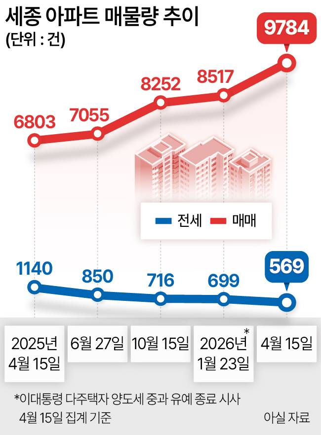 [헤럴드경제=김희량 기자] ‘팔겠다’고 내놓은 세종 아파트 매물량이 1년 사이 44% 늘었다. 행정수도 이전 당시 투자했던 외지인들이 다주택자 규제 강화에 따라 매도하기로 마음먹은 데 따른 것이다. 게다가 최근 이재명 대통령이 다주택 공무원들을 주택 업무에서 배제하라고 지시한 데 따라, 불이익을 우려한 공무원 보유 매물도 추가로 나오고 있다.