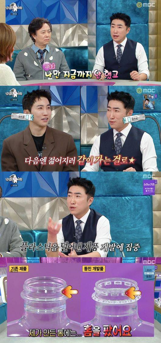 특히 장동민은 "친환경 쪽에서 일한 지 오래됐다 보니까 요즘 플라스틱 사용 줄여야 한다고 하는데 실질적으로 사용 안 할 수 없다. 그래서 질량을 줄여보자, 필요없는 부분을 덜어내서 해보면 어떨까 해서"라며 기존 제품과 개발한 제품 두개를 공개했다.