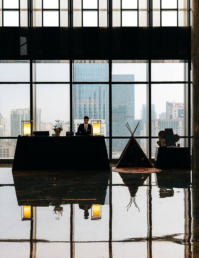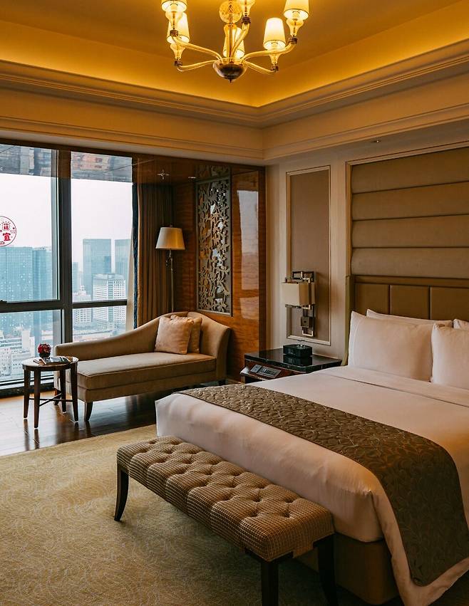 청두는 쓰촨성뿐만 아니라 중국 서부의 행정, 경제 중심지이기 때문에 유난히 도심에 호텔이 가득하다. 실제로 청두는 중국에서 럭셔리 호텔 브랜드가 가장 빠르게 들어오는 내륙 도시로도 꼽힌다. 그래서 웬만한 글로벌 호텔 브랜드라면 거의 다 있는데, 그 중심의 단 한 곳을 꼽자면 아무래도 '리츠칼튼 청두'겠다. 리츠칼튼 청두의 자리는 청두 황성(皇城) 구역의 터다. 예로부터 관청, 궁정 건물이 모여 있던 자리라, 말하자면 청두의 역사적 중심이다. 청두의 명동이라 불리는 티엔푸 광장은 호텔에서 도보 10분 거리에 위치한다. 시원하게 솟은 반듯하고 직선적인 통유리 건물의 24층부터 41층까지가 호텔이다. 총 350개의 객실을 갖췄으며 119개의 리츠칼튼 클럽 레벨 객실과 54개의 스위트룸에는 전담 컨시어지 서비스를 제공한다. 참고로 리츠칼튼 청두는 중국 내 리츠칼튼 중 유일하게 클럽 레벨 투숙객에게 개인 버틀러 서비스를 제공하는 곳이다.