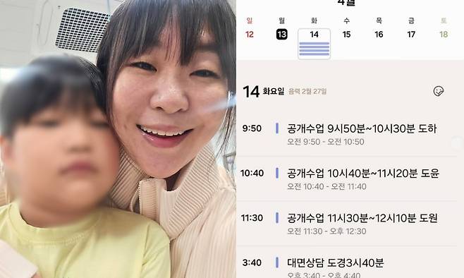정주리는 14일 자신의 계정을 통해 "학부모 공개수업. 겹치는 시간 없이 모두 참여할 수 있어서 다행이었어요"라는 글과 함께 사진을 공개했다. 이날 정주리가 올 사진에는 오전 9시 50분부터 시작해 오후 3시 40분 대면 상담까지 이어지는 빼곡한 학교 일정이 담겨 눈길을 끌었다.
