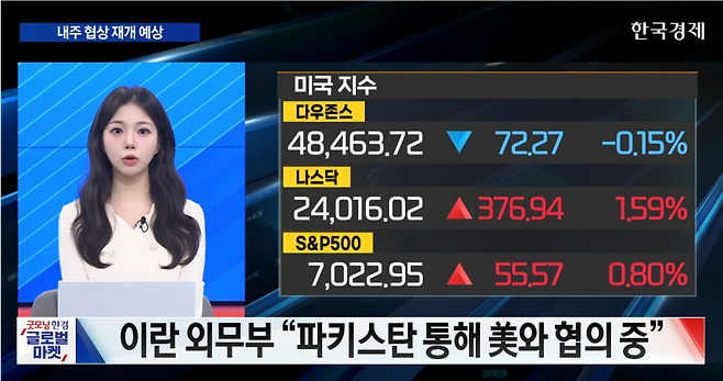 오늘장 미 증시 상승 마감했습니다. 산업주가 부진하며 다우 지수가 약보합권에 마감했지만, 나스닥은 사상 최고치를 경신하고 S&P500지수도 장중 기준으로 석 달 만에 7천선을 회복하고 종가 기준으로 처음으로 7천선을 돌파했습니다. 반도체주 사이에서는 희비가 엇갈리긴 했지만 AI 양자 컴퓨팅 기술을 발표한 영향이 이어지며 엔비디아 1.2% 그리고 메타와 AI칩 생산 확대 계약을 체결한 브로드컴이 4.1% 오르는 등 기술주가 시장을 주도했습니다. VIX 지수도 전쟁 발발 이후 최저 수준을 보이는 등 시장이 전쟁 충격에서 회복하는 모습을 보이고 있습니다. 트럼프 대통령이 “전쟁이 거의 끝났다”고 말하자 오늘도 종전 기대감과 기업 호실적이 시장을 끌어 올렸습니다. 이란이 트럼프 대통령이 원하는 대로 조속한 합의에 동의할지는 여전히 미지수이지만, 간밤 이란은 “파키스탄을 통해 미국과 메시지 교환을 이어가고 있으며 핵 농축 수준과 방식에 대해 협상할 의향이 있다”고 밝혔습니다. 여기에 더해 시장이 바라는 호르무즈 재개방에 긍정적인 이야기도 나왔습니다. 로이터는 소식통을 인용해 “이란이 협상에 대한 우호적인 태도의 일환으로 선박들이 호르무즈 내 오만 측 수역을 통과하는 것은 허용하는 방안을 검토하고 있다”고 보도했습니다. 악시오스가 “아직 최종 타결이 보장된 건 아니지만 양측이 종전을 위한 기본 합의에 거의 근접했다”고 보도한 점까지 더해지며 이란이 핵심 쟁점에서 그래도 유연한 태도를 보일 수 있다는 기대감이 퍼지고 있습니다. 그리고 장 막판 “다음주 파키스탄에서 2차 종전협상이 이뤄질 가능성이 높다”는 파키스탄 당국자의 발언까지 나오자, 예측시장인 폴리 마켓에서는 4월 말까지 종전이 이뤄질 것이란 베팅이 81%까지 높아졌습니다. 이에 대해 웰스파고는 시장이 들뜬 상태라고 표현하며 “석 달 안에 S&P500 지수가 7300까지 올라갈 수 있다”고 전망했습니다. 골드만삭스 역시 “불확실성의 정점은 지났다”며 “시장은 작은 개선 신호라도 포착하려 하고 그에 따라 반응하고 있기 때문에 지수가 곧 다시 한 번 사상 최고 기록을 세울 수 있다”고 목소리를 더했습니다.