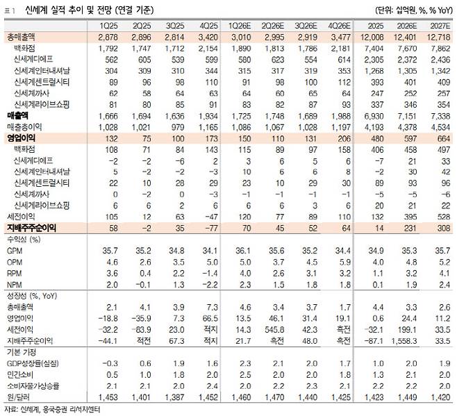 박종렬 흥국증권 연구원은 "2026년 백화점이 EBIT(이자 및 세금 납부 전 이익) 증익을 주도하는 가운데, 면세점과 패션, 호텔 등대부분 자회사들의 고른 실적 개선으로 영업실적 모멘텀은 강화될 전망"이라며 "주주환원 확대를 통한 주가 재평가도 지속될 것"이라고 내다봤다.