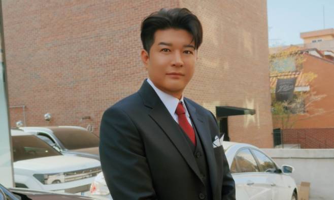 공개된 사진 속 신동은 몸에 딱 맞는 수트 차림으로 결혼식 마이크를 잡고 있는 모습이다.