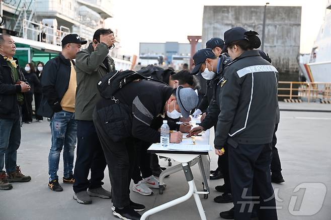 (목포=뉴스1) 이수민 기자 = 세월호 참사 12주기인 16일 오전 전남 목포시 해경 전용 부두에서 선상추모식에 참여하는 세월호 유가족들이 부두에 오르고 있다.(공동취재) 2026.4.16/뉴스1