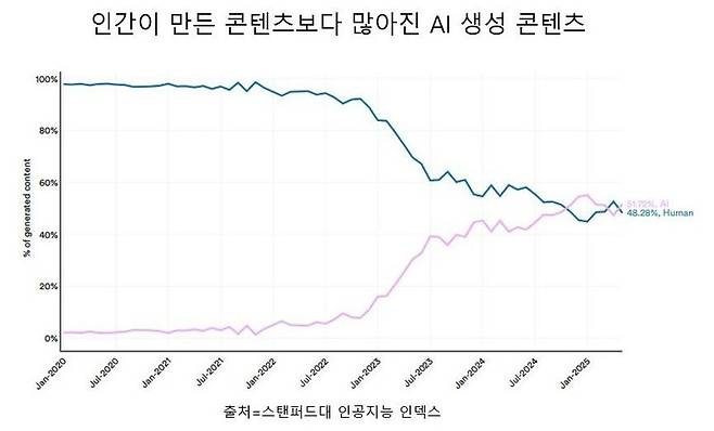 보고서는 “생성형 인공지능은 3년 만에 전 세계 인구의 53%가 사용하는 수준에 이르렀다”며 “이는 개인용 컴퓨터나 인터넷 보급보다 빠른 속도”라고 밝혔다. 검색엔진 최적화(SEO) 기업 그래파이트 조사에 따르면 2022년 11월 챗지피티(ChatGPT) 출시 이후 인공지능이 생성한 콘텐츠가 비약적으로 늘어 2025년 1월을 기점으로 새로 게시되는 온라인 콘텐츠의 50%를 넘어섰다.