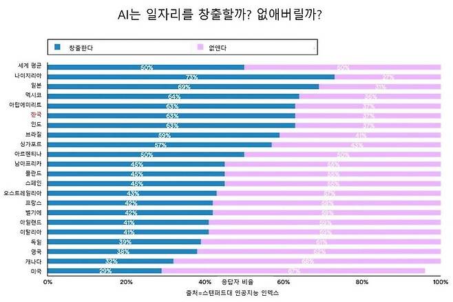 인공지능이 새로운 일자리를 창출할 것인지 아니면 일자리를 줄일 것인지에 대한 의견은 반반이었다. 한국은 새 일자리를 만들 것으로 보는 사람이 63%로 더 많았다. 반면 서유럽 나라들은 새 일자리를 만들 것으로 보는 사람이 40%대로 더 적었다.