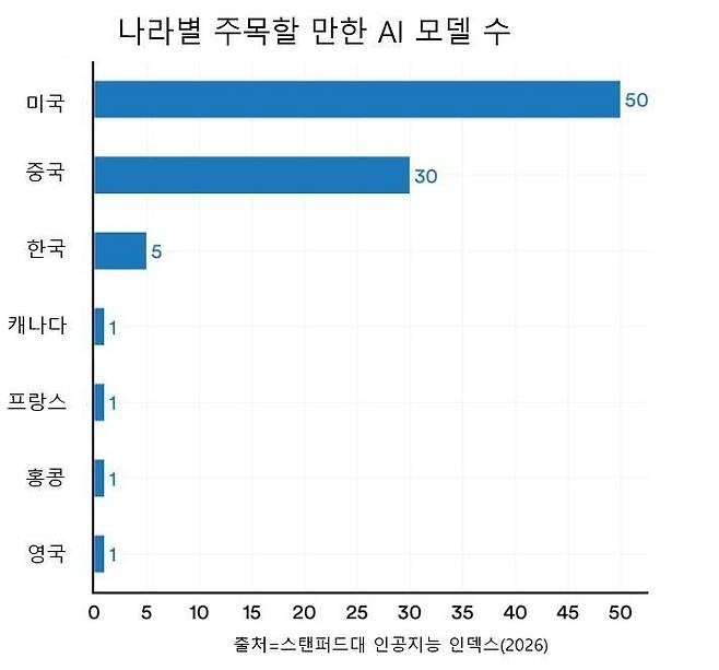 2025년까지 개발한 인공지능 모델 중 주목할 만한 것은 미국이 50개, 중국이 30개로 평가됐다. 반면 중국은 가장 많이 인용된 논문 100편에서 차지하는 비중이 2021년 33편에서 2024년 41편으로 증가했다.