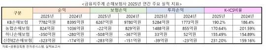 16일 한국금융신문이 금융지주계 손해보험사(KB손해보험·농협손해보험·하나손해보험·신한EZ손해보험)의 2025년 연간 경영공시를 분석한 결과, KB손해보험의 순익은 7782억원으로 전년 대비 7.3% 감소했다.