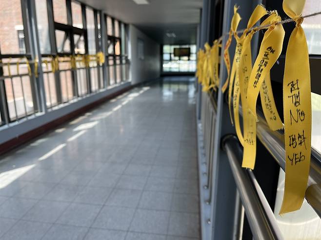| ▲ 전교생이 적어 매단 노란 리본에는 '잊지 않겠다'는, '기억하겠다'는 다짐과 함께 이란 전쟁을 떠올리며 반전의 메시지를 적은 것도 드문드문 눈에 띈다. |