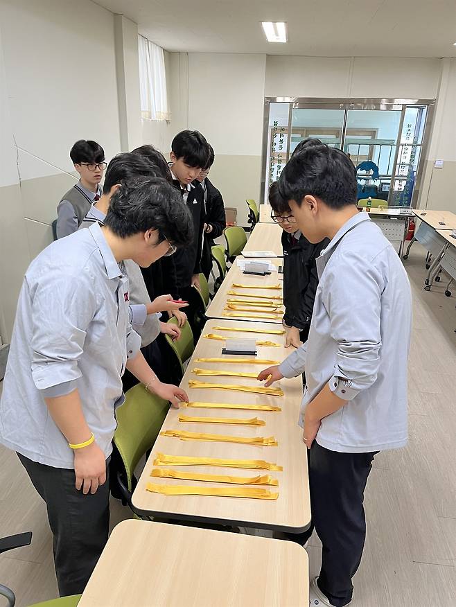 | ▲ 세월호 참사 12주기 이틀 전날 저녁, 학생자치회 친구들이 학생자치회실에 모여 각 학급에 나눠줄 리본을 자르고 배분하고 있다. |