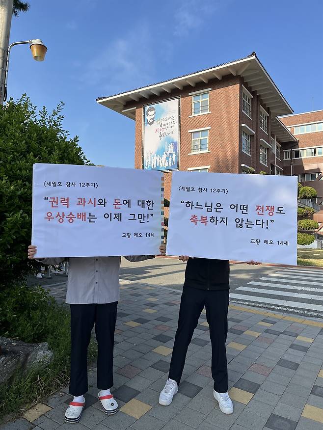 | ▲ "하느님은 그 어떤 전쟁도 축복하지 않는다"는 교황 레오 14세의 일갈이 올해 세월호 참사 12주기 추모 행사 주제가 됐다. 학생자치회 친구들이 교문에서 캠페인 활동을 벌이고 있다. |