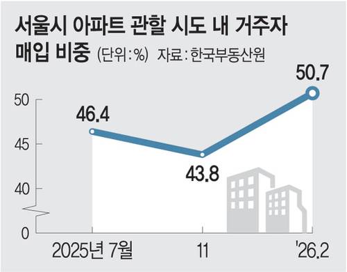 지난 2월 서울 아파트 거래 중 ‘관할 시도 내’(동일 광역자치단체 중 관할 시군구 제외) 거주자의 아파트 매입 비율은 50.7%로 나타났다. 서울 강남구로 보면 강남구를 뺀 나머지 서울 지역이 관할 시도 내 지역이다. 이 비율은 지난해 7월 46.4%, 11월 43.8% 등을 기록하다 다주택자 급매물이 시장에 나오기 시작한 지난 2월 과반을 넘겼다. 강남 3구와 용산구 아파트값은 약 100주간 상승 끝에 지난 2월 넷째 주 처음 하락 전환한 바 있다.