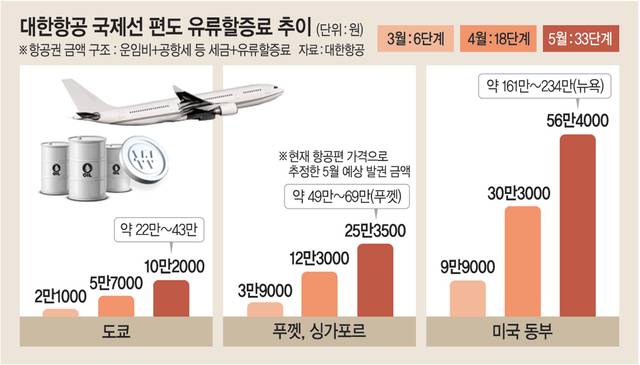 대한항공은 편도 기준 유류할증료를 5월 발권하는 항공권부터 최소 7만5000원에서 최대 56만4000원을 부과할 계획이다. 이달 발권 항공권에 적용되는 유류할증료는 4만2000원에서 30만3000원인데, 당장 다음 달부터 발권 시 최소 3만3000원에서 최대 26만1000원을 더 내야 한다. 한국인들이 가장 많이 찾는 도쿄행 항공권 유류할증료는 5월 발권 기준으로 10만2000원, 싱가포르 등 동남아는 25만3500원, 뉴욕 등 미국 동부는 56만4000원이다.