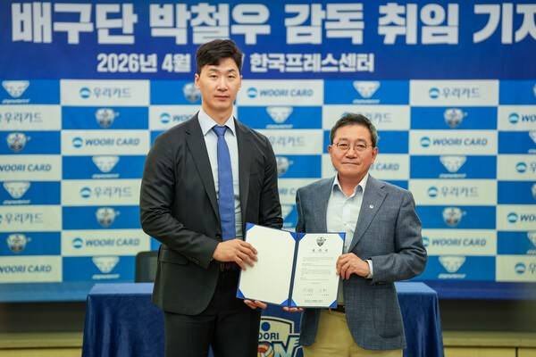 우리카드와 3년 계약을 맺은 박 감독은 계약서에 서명한 뒤 진 대표이사와 기념 촬영을 했고, 우리금융그룹 전 직원이 패용하는 사원증과 휘장도 받았다.