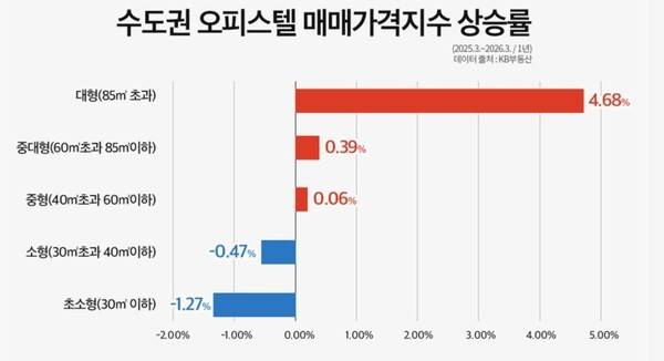 중대형 시장으로도 온기가 확산되고 있다. 전용면적 60㎡ 초과~85㎡ 이하 중대형 오피스텔 매매가격지수는 지난해 11월 이후 5개월 연속 상승했으며, 상승률은 0.74%를 기록했다. 이는 전년도 같은 기간(-0.51%) 대비 1.25%포인트 개선된 수치다.
