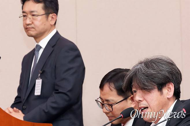 | ▲ 입 연 남욱 변호사, 증언대에 선 정일권 검사 대장동 개발사업 특혜 의혹으로 재판받고 있는 남욱 변호사(오른쪽)가 16일 서울 여의도 국회에서 열린 '윤석열 정권 정치검찰 조작기소 의혹 사건 진상규명 국정조사'에 증인으로 출석해 답변하고 있다. 맨 왼쪽은 정일권 검사. 2022년 당시서울중앙지검 반부패수사1부 부부장검사로 대장동 수사를 주도했던 정 검사는 대장동 개발사업 민간업자인 남욱 변호사를 조사하는 과정에서 가족사진을 보여주며 진술을 압박한 의혹을 받고 있다. |