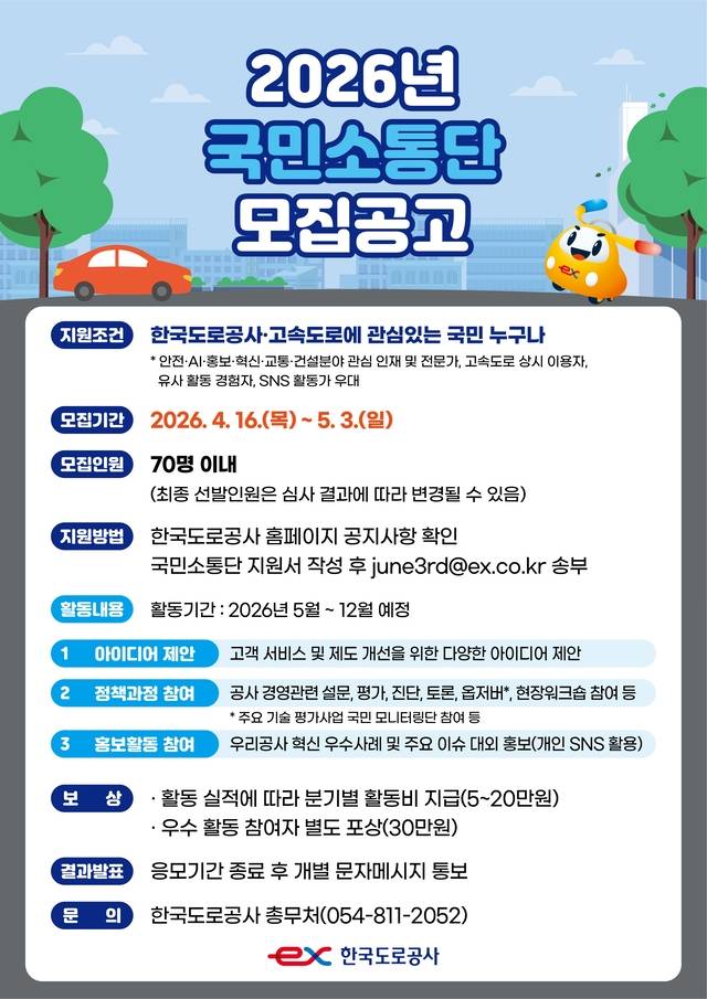 한국도로공사(사장 직무대행 이상재)는 고속도로 서비스 향상을 위해 국민의 의견을 정책에 반영하는 ‘한국도로공사 국민소통단’을 4월 16일부터 5월 3일까지 모집한다고 밝혔다.