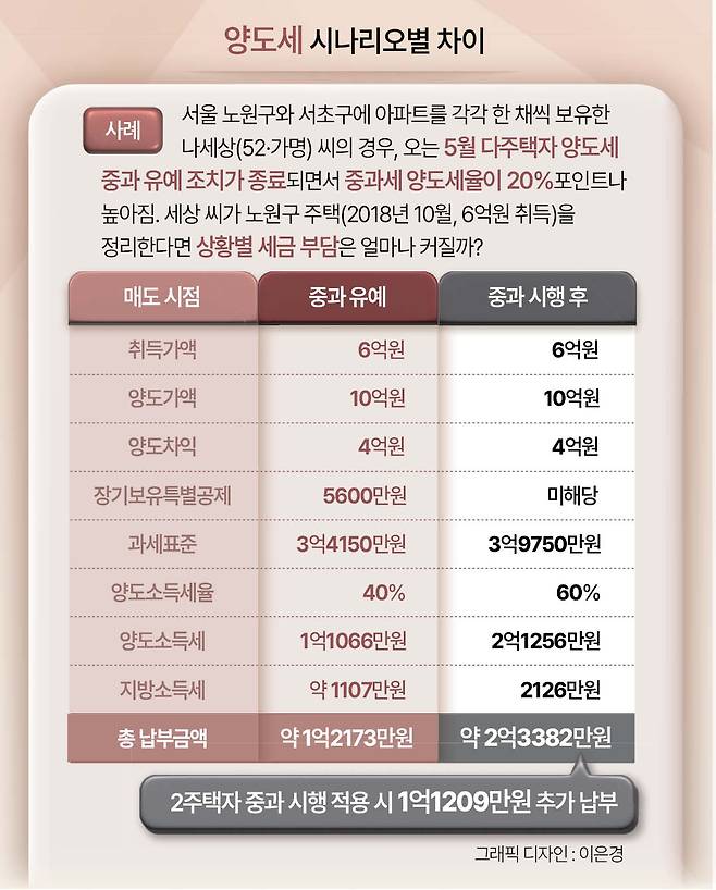 서울 노원구와 서초구에 아파트를 각각 한 채씩 보유한 나세상(72·가명) 씨의 경우, 양도세율이 20%포인트 높아진다고 한다. 최근 세상 씨 부부는 세무사 사무실과 은행 VIP 창구를 오가며 매도·증여·저가양도 등 시나리오별 세 부담을 비교하느라 분주하다.
