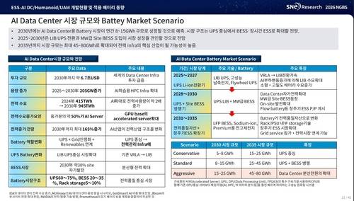 AI 데이터센터용 배터리 시장은 2030년 연간 8~15GWh, 공격적 시나리오에서는 15~25GWh 규모로 성장할 수 있고, 2035년에는 최대 45~80GWh까지 확대될 가능성이 있는 것으로 제시됐다.