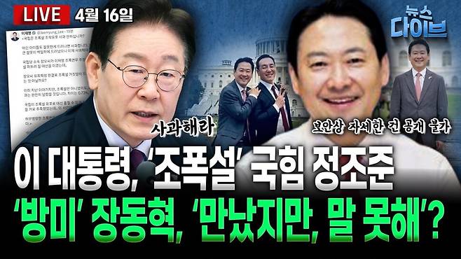 이 대통령 "'조폭연루설' 유포...국힘 공식 사과 기다린다"/'조폭설 주도' 박철민 가족, '윤 당선 직후 공천' 의혹/장동혁 "선거 위해 미국 방문", "자세한 건 보안상 비공개"/당대표 자리 비운 사이...떠오르는 '한동훈 복당론'?/'원내대표 조기 선출론'에 송언석 "자리 연연 안 해"/정청래 "하정우 좋아해?" 전재수 "사랑합니다"/한국리서치, 김부겸 44% 대 이진숙 26%/김성태 "'연어·술파티' 불가능...이재명 공범 아냐"/국조특위 "리호남 봤다는 방용철, 위증 혐의로 고발"/남욱 "검사, '목표는 하나'" VS 정일권 "말한 적 없다"/세월호 12주기...기억은 바래지 않았다/국힘 지도부, 세월호 기억식 불참 "사전 접수 못 해".