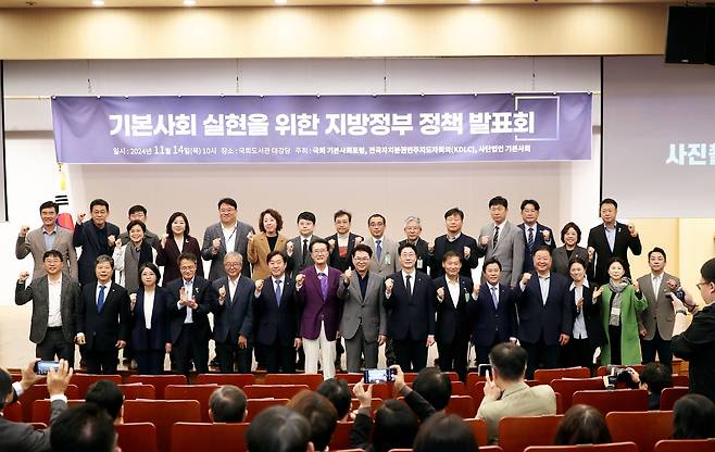| ▲ 정명근 화성시장이 14일 국회도서관 대강당에서 열린 기본사회 실현을 위한 지방정부 정책 발표회에 참석해 '화성형 기본사회' 우수 사례를 발표한 뒤 참석자들과 기념 촬영을 하고 있다. |