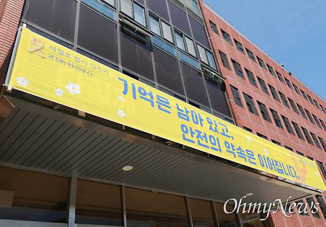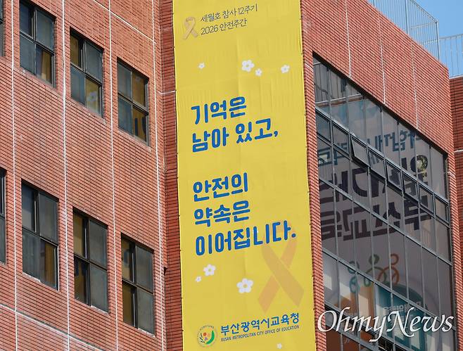 세월호 참사 12주기를 맞은 16일 오후, 부산시교육청 청사 외벽에 '기억은 남아있고, 안전의 약속은 이어집니다'라는 내용의 펼침막이 부착돼 있다. 지난 13일부터 17일까지 안전주간을 설정한 김석준 부산시교육감은 추모의 의미를 되새기는 시간을 마련했다. 이날 오전 10시엔 전 직원이 묵념을 실시하고, 일선 학교에는 자율적 참여를 안내했다.