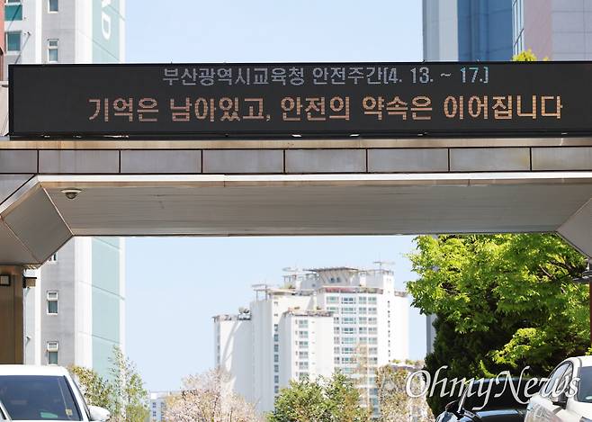 | ▲ 세월호 참사 12주기인 4월 16일 부산시교육청 전광판에 추모 글귀가 게시되고 있다. |