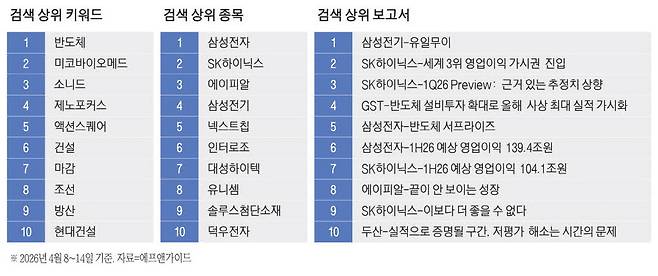 삼성전자와 SK하이닉스 주가가 전쟁의 충격에서 벗어나 전고점 부근까지 올라왔지만 이들 기업의 주가 상승 여력에 대한 시장의 믿음은 여전하다. 이 기간 가장 많이 검색된 리포트 10위권에는 삼성전자와 SK하이닉스 관련 리포트가 6건에 달했다. 다음주 실적 발표를 앞둔 SK하이닉스에 대한 리포트가 4건으로 가장 많았다.