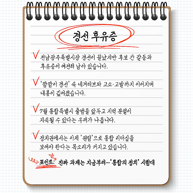 ▶ 전남광주특별시장 경선이 끝났지만 후보 간 갈등과 후유증이 여전히 남아 있습니다.