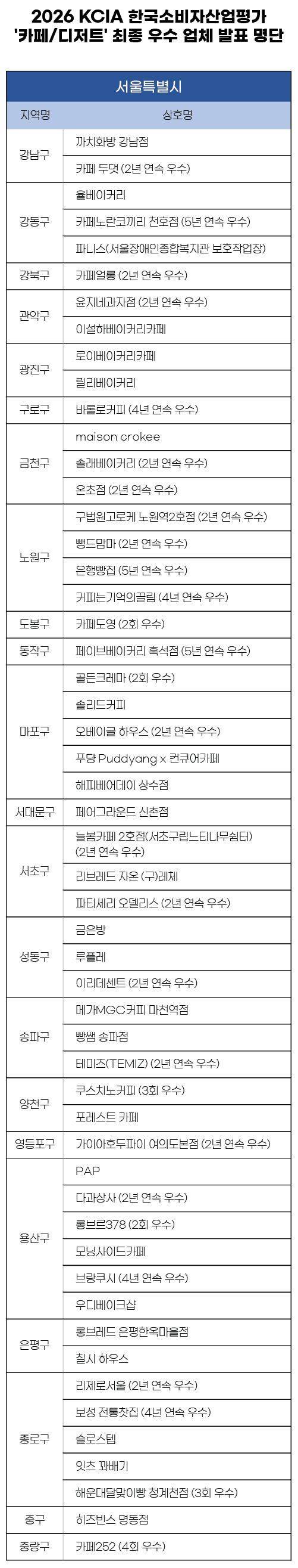 KCA한국소비자평가는 대한소비자협의회가 주최하고 한국소비자평가가 주관하는 <2026 KCIA 한국소비자산업평가 '카페/디저트'> 서울 지역 평가 결과를 발표했다.