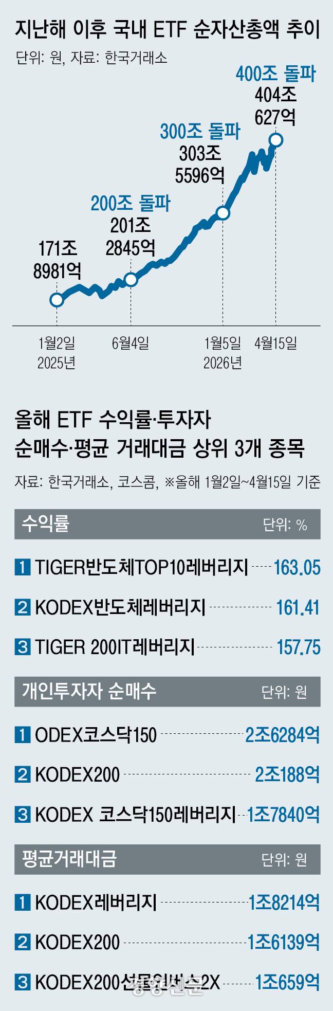전날부터 이어진 상승 흐름으로 국내 ETF의 순자산총액과 시가총액은 지난 15일 기준 약 404조원으로 400조원을 넘어섰다. 지난해 6월 4일 200조원을 넘기고, 올해 1월 5일 300조원을 연달아 돌파하면서 ‘파죽지세’를 달리고 있는 것이다.