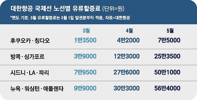 대한항공은 다음달 1일부터 31일까지 발권되는 국제선 항공권에 노선별 이동 거리에 따라 편도 기준 7만5000~56만4000원의 유류할증료가 부과된다고 16일 홈페이지에 공지했다.