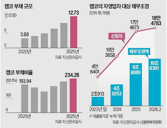 자영업자와 기업 구조조정 등을 지원하는 한국자산관리공사(캠코)의 부채 규모가 12조원을 넘어 사상 최대치를 기록했다. 소상공인과 자영업자 채무조정 프로그램인 ‘새출발기금’ 수요가 급증한 영향이다. 정부 지원이 없으면 불황으로 빚을 못 갚는 자영업자가 파산 직전 마지막으로 기댈 수 있는 공적기관인 캠코의 건전성이 더욱 악화할 것이란 전망이 나온다.