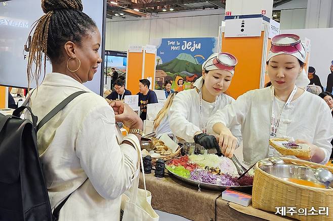 홍보관에서는 제주만의 독특한 '미식 네트워킹'이 외국인들의 시선을 사로 잡았다. 제주는 '해녀의 부엌'과의 협업을 통해 해녀 소라 물회, 돔베고기 등을 선보였다.