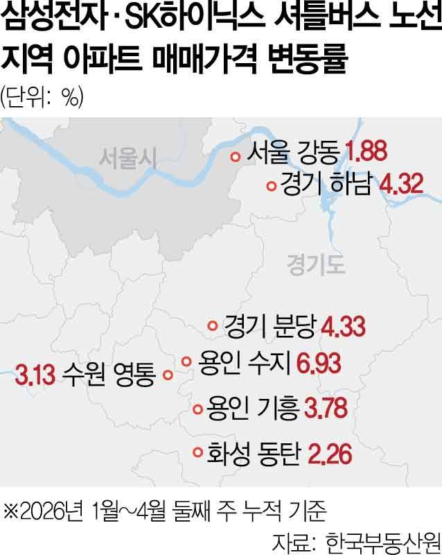 삼성전자(005930)와 SK하이닉스(000660) 출퇴근 셔틀버스 노선이 다니고 지하철 접근성이 좋은 지역을 일컫는 '셔세권(셔틀버스+역세권)' 단지에서 올 들어 신고가 경신 흐름이 이어지고 있다.