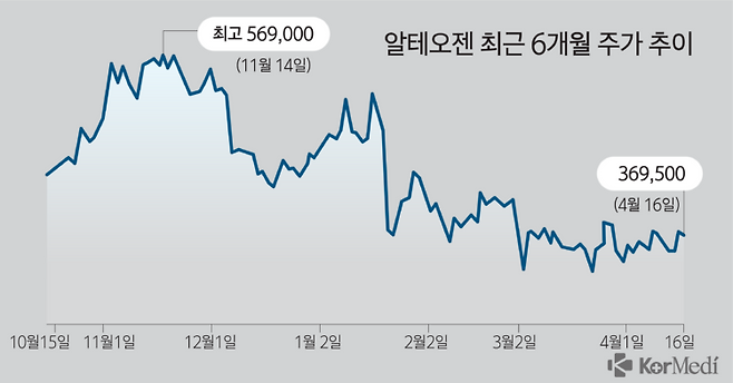 MSD는 올해 1월 분기보고서를 통해 알테오젠에 대한 로열티 비율을 2%라고 공시했다. 당초 양사가 비율을 공개하지 않은 가운데 업계에서는 4~5% 수준으로 예측하고 있었는데, 이보다 크게 낮은 것으로 확인되면서 주가가 급락했고, 석 달이 지난 지금도 코스닥 1위 자리를 되찾지 못한 상황이다.