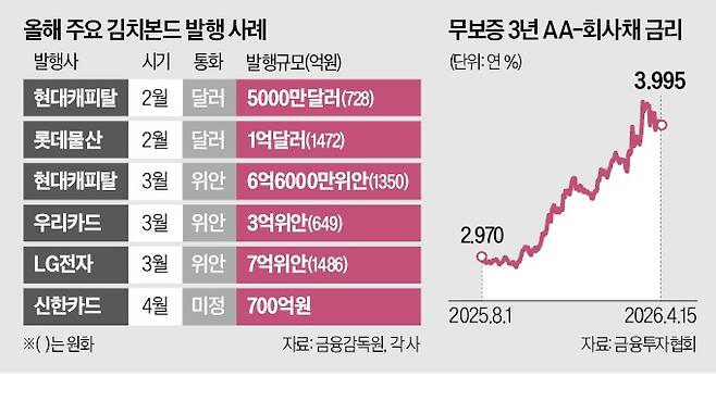 달러화로 표시된 김치본드 발행도 확대되는 추세다. 현대카드(2000만달러) 현대캐피탈(5000만달러) 우리카드(5000만달러) 롯데물산 (1억달러) 등이 잇따라 달러화 표시 김치본드를 발행했다. IB업계 관계자는 “신용도가 높은 카드사가 유리한 조건으로 김치본드를 발행해 조달금리를 낮추는 데 성공하면 일반 제조기업들도 시장에 본격적으로 뛰어들 것”이라고 내다봤다.