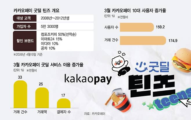 카카오페이가 선보인 10대 전용 할인 서비스 ‘굿딜 틴즈’가 입소문을 타고 출시 한 달여 만에 청소년 이용자 5만여 명을 끌어모았다. 10대 인기 브랜드를 대상으로 별도 쿠폰 없이 최대 50%의 할인 혜택을 즉시 제공하는 결제 구조가 주효했다. 시장에서는 미래 충성 고객 확보에 도움이 되지 않겠느냐는 분석이 나온다.