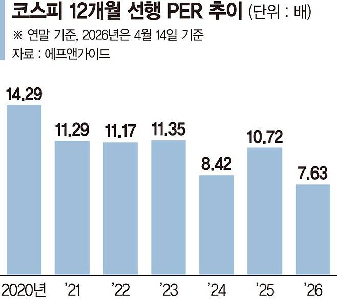 16일 금융정보업체 에프앤가이드에 따르면 지난 14일 기준 코스피의 12개월 선행 주가수익비율(PER)은 7.63배다. 지난 13일에는 7.42배까지 내렸다. 지난해 연말(10.72배)과 비교해도 급격히 하락했다. 12개월 선행 PER은 현 주가를 향후 1년간 기업이 벌어들일 순이익 전망치로 나눈 값이다. 통상 증권가에선 이 수치가 8배 밑으로 떨어지면 상당한 '저평가' 구간으로 보고, 추가 매수를 권장한다.