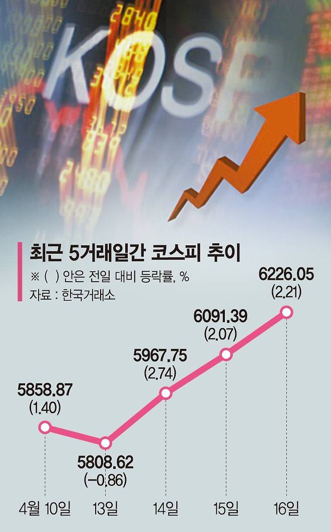 16일 증권업계에 따르면 코스피는 이날 전 거래일 대비 2.21%(134.66p) 오른 6226.05에 마감했다. 지난달 말 5052p 수준이던 코스피는 4월 들어 단 2주만에 1000p 넘게 급등했다. 통상적인 이익 증가 속도나 거시 변수 변화를 감안할 때 설명하기 어려운 수준의 상승 폭이다.
