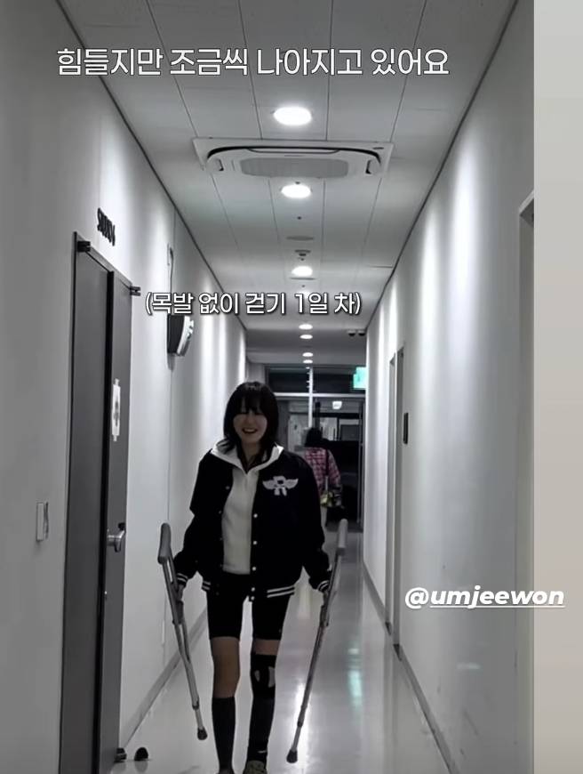 영상 초반부 엄지원은 재활 초기의 모습으로 등장한다. 당시 엄지원은 대기실 복도에서 목발에 의지한 채 조심스럽게 한 발 한 발 내딛는 모습을 보여줬다. 그는 "비틀거리지 말고 똑바로 걸어야 한다"고 스스로를 다잡으며 의지를 드러냈지만, 생각처럼 따라주지 않는 다리 상태에 어려움을 겪는 모습도 보였다. 그럼에도 불구하고 엄지원은 미소를 잃지 않는 모습에서 강한 정신력을 뽐냈다.
