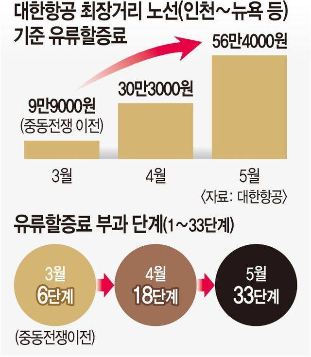 대한항공은 이달엔 편도 기준 4만2000원∼30만3000원의 유류할증료를 책정 중이고, 중동 전쟁 전인 3월에는 최대 9만9000원을 운임에 더했다.