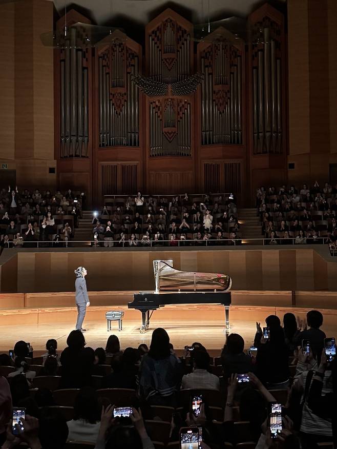 산토리홀은 이날 우리나라 공연장으로 바뀌었다. 언뜻 보면 한국 청중이 더 많은 것 같았다. 콘서트 40분 전, 산토리홀 입구에 길게 늘어선 청중은 홀의 웅장한 파이프오르간과 같은 재질로 만들어진 오르골의 팡파르를 보면서 벌써 축제 분위기를 실감했다.긴 머리카락이 연주에 방해가 돼 뒤로 묶은 헤어스타일로 바꾼 임윤찬이 무대로 나올 때부터 열광의 도가니였다. ‘팬덤’은 굳건해 보였다. 옆자리에 앉은 ‘임윤찬 팬카페’ 회원은 2년 동안 무려 5000회의 댓글을 달고 나서야 공연 이틀 전에 좋은 자리를 구할 수 있었다고 귀띔해 주었다.
