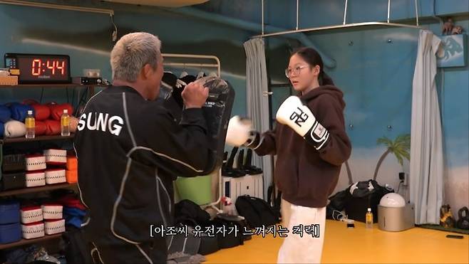 추성훈은 마지막으로 함께 운동 영상을 남기자고 제안했고, 사랑이는 흔쾌히 응했다. 운동 전 추성훈은 직접 사랑이의 근육을 풀어준 뒤, 미트를 들고 딸의 펀치를 받아주며 시간을 보냈다. 딸이 잘할 때마다 아낌없이 칭찬을 건네는 모습에서는 '딸 바보' 면모가 그대로 드러났다. 반면 사랑이는 다소 쑥스러워하는 반응을 보여 웃음을 자아냈다.
