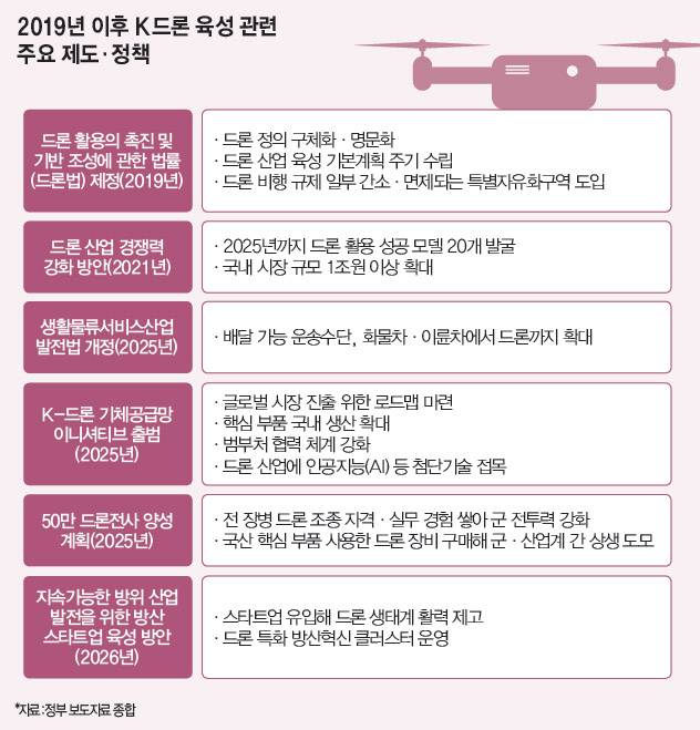 드론 산업을 바라보는 산업통상자원부·국토교통부 등 정책당국의 인식 변화도 플러스 요소다. 2010년대 중반까지 정책당국은 드론 산업을 ‘규제의 대상’으로 봤다. 조종 자격, 신고, 비행 승인 등 대부분 기준이 항공법 체계 안에서만 다뤄지면서 산업 육성을 위한 별도 정책 수단은 사실상 부재했다. 그럴 수밖에 없던 이유도 있다. 2014년과 2015년 서해5도·강원도에서 추락한 북한 무인기가 발견되고, 일부는 청와대 영공까지 침투한 사실이 확인되면서다.