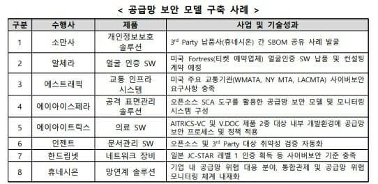 이 사업을 통해 의료, 교통, 보안, 금융 등 다양한 산업군에서 외부 소스코드 최초 도입부터 배포 후 모니터링까지 SBOM을 활용해 관리하는 공급망 보안 공통 모델을 발굴했다. 美·EU등의 SBOM 및 공급망 보안 체계 구축 요구 등 글로벌 규제 대응 사례(에스트래픽, 에이아이트릭스, 한드림넷) 와 기업의 SW 자산의 일종으로 볼 수 있는 SBOM을 안전하게 공유하고 수신할 수 있는 SBOM 공유 모델(휴네시온, 소만사), 시범사업으로 구축한 공급망 보안 공통 모델을 고도화해 기업 안면인증 SW, 문서관리 SW 등 기업별 SW에 맞게 적용한 공급망 보안 내재화 사례(에이아이스페라, 인젠트, 알체라)를 각각 발굴했다.