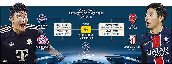 ‘코리안 더비’ 4강 1차전은 오는 29일 프랑스 파리 파르크 데 프랭스에서, 2차전은 다음 달 7일 뮌헨 알리안츠 아레나에서 각각 개최된다.