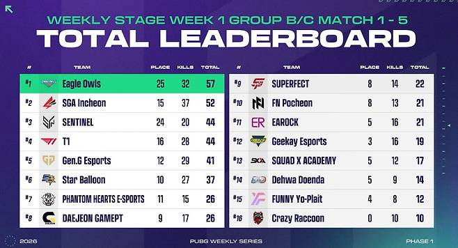 (엑스포츠뉴스 이정범 기자) '2026 PWS: 페이즈 1' 이글 아울스가 1주 차 위클리 스테이지 목요일 B·C조 경기 1위에 올랐다